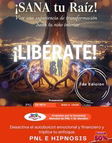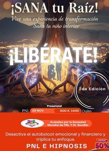Tu transformación definitiva llega en solo 6 horas! Libérate de la inseguridad, miedos y ansiedad con nuestro Taller Intensivo de PNL e Hipnosis Terapéutica. Vamos a sanar tu raíz (tu niño interior) para desmantelar tus bloqueos. Este es el momento de tu paz. Aprovecha la oportunidad única de instalar una mentalidad poderosa y libre de autosabotaje.